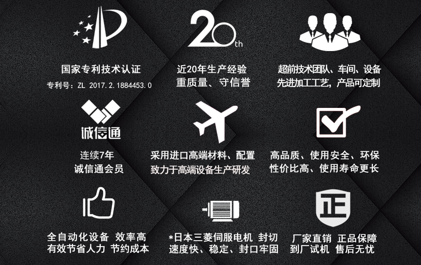 擁有多項專利技術(shù) 數(shù)千平標(biāo)準(zhǔn)廠房 批量標(biāo)準(zhǔn)化生產(chǎn) 可定制開發(fā)和自動化流水線搭建! 超前技術(shù)團隊 先進(jìn)加工工藝 高精度加工設(shè)備 近20年專業(yè)研發(fā)經(jīng)驗不斷改進(jìn)、創(chuàng)新、突破!我們定位于專注做中高端全自動熱收縮膜包裝機,請不要拿我們和不同定位的廠家對比!我們是源頭工廠…